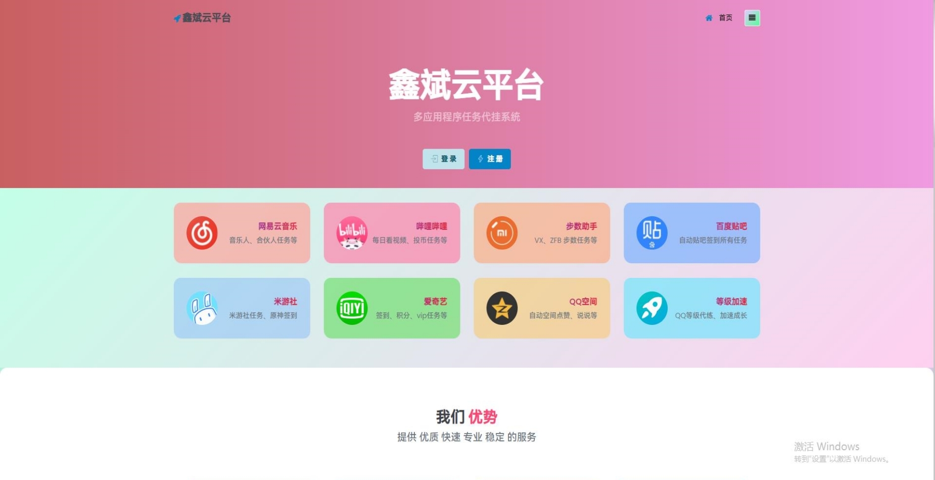 - 2018年04月05日,工作室研发新项目自动代挂服务器—“鑫斌代挂网”。采用阿里云高安全服务器,保证用户帐号安全,独家服务器秒级全能挂机,执行所有加速任务,快速安全稳定!