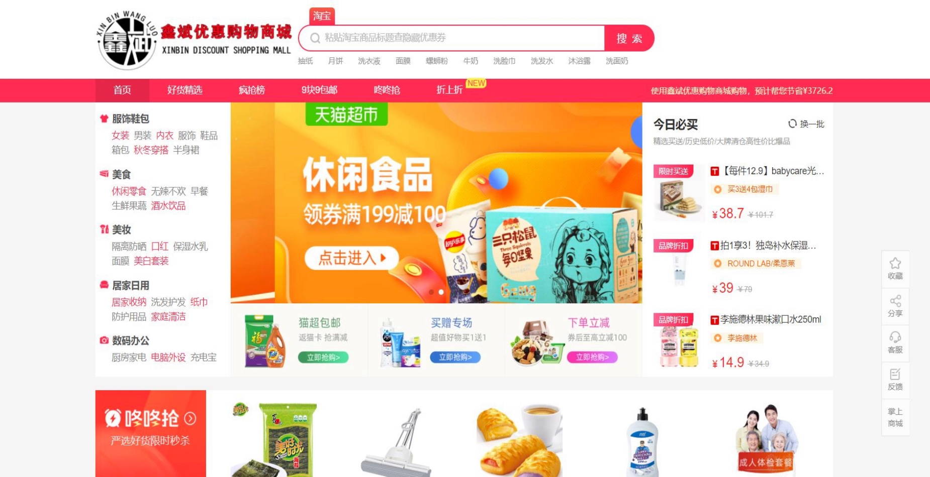 - 2019年06月21日,团队研发项目“鑫斌优惠购物商城”网站升级搭建完成,并发展成为全网最齐全实惠的优惠卷网购平台之一。