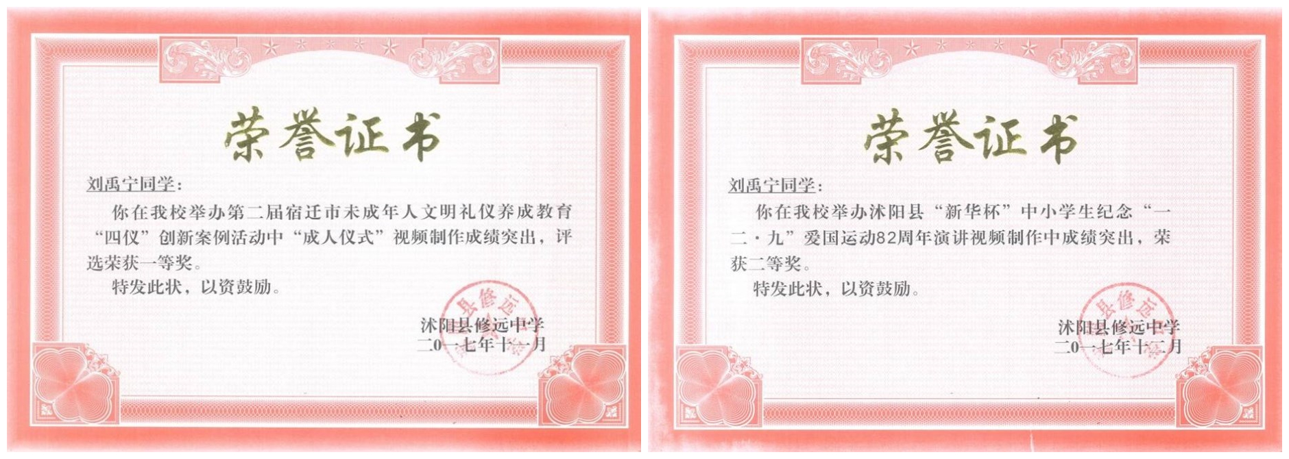 - 2017年12月14日,学校活动视频《成长感恩,梦想起航》获得第二届宿迁市未成年人文明礼仪养成教育“四仪”创新案例成人礼仪一等奖,并获得个人荣誉证书。
