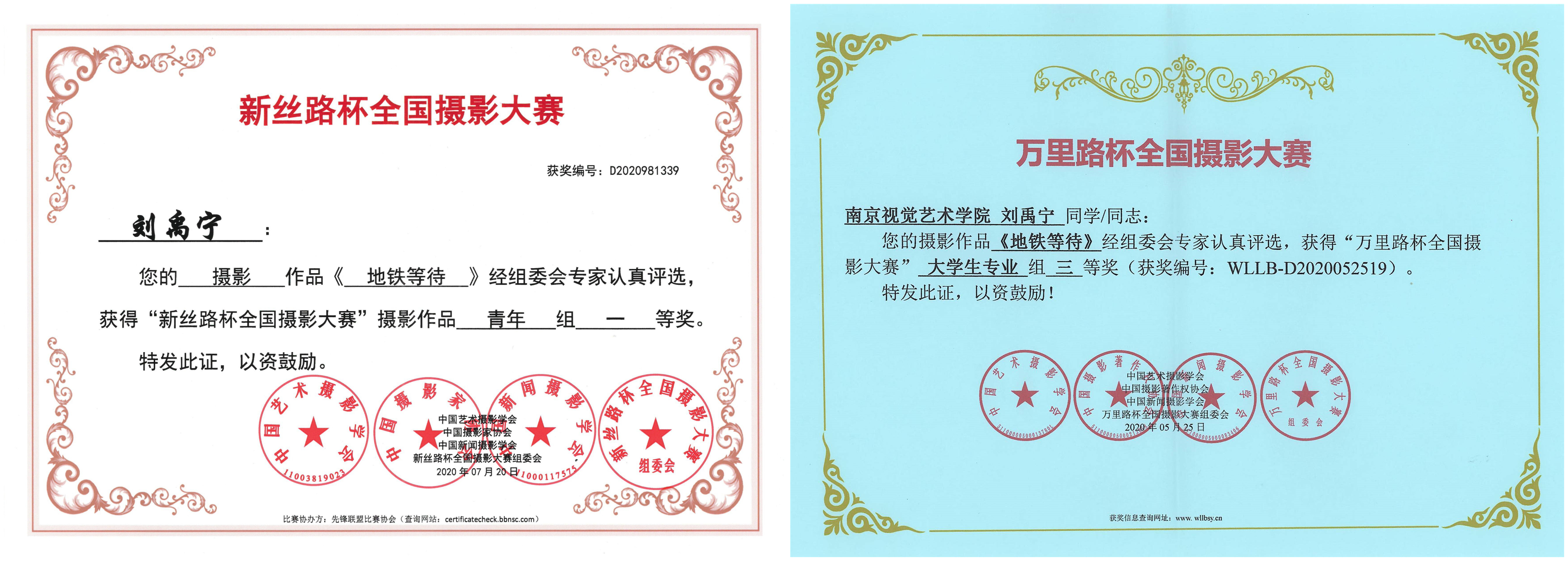 - 2020年07月20日,摄影作品《地铁等待》荣获“新丝路杯全国摄影大赛”青年组一等奖。