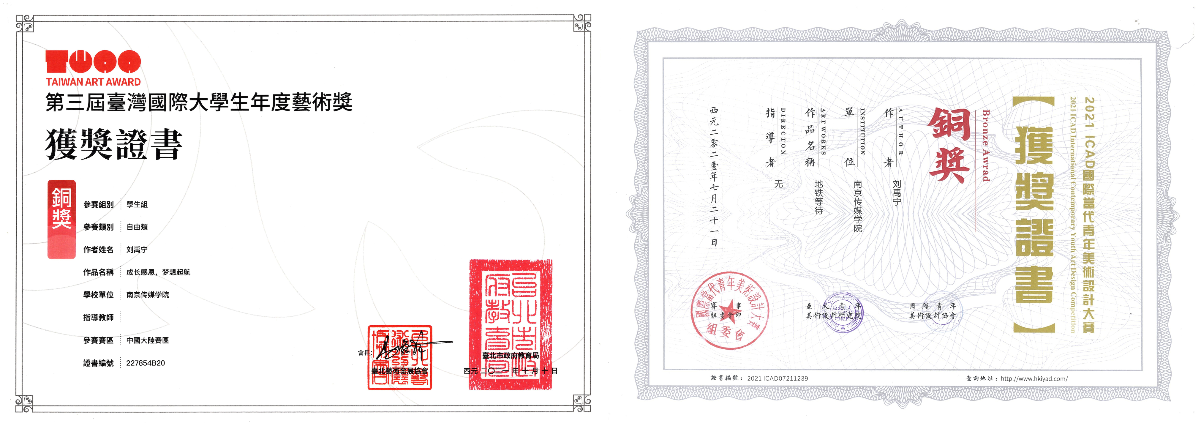 - 2021年07月21日,摄影作品《地铁等待》荣获2021年ICAD国际当代青年美术设计大赛铜奖。