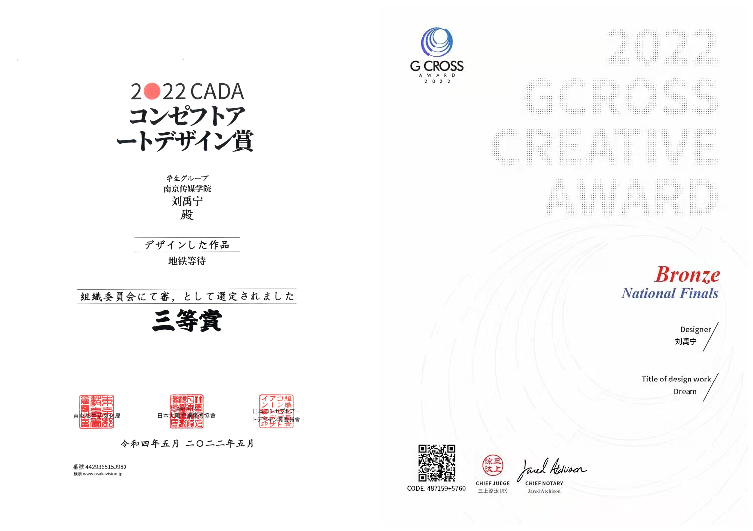 - 2022年03月28日,荣获2022年第二届G-CROSS全球大学生创意金星奖铜奖。