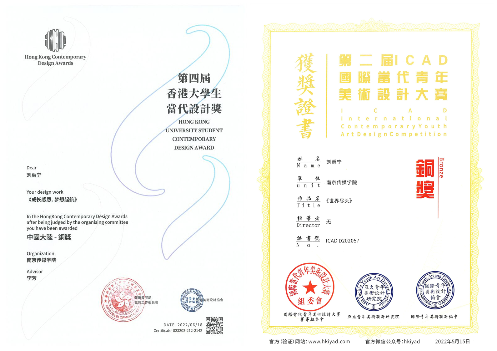 - 2022年06月18日,影视作品《成长感恩,梦想起航》荣获第四届香港大学生当代设计奖铜奖。