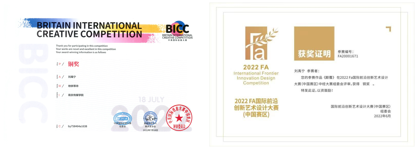 - 2022年06月26日,影视作品《颠覆》荣获2022年FA国际前沿创新艺术设计大赛(中国赛区)铜奖。