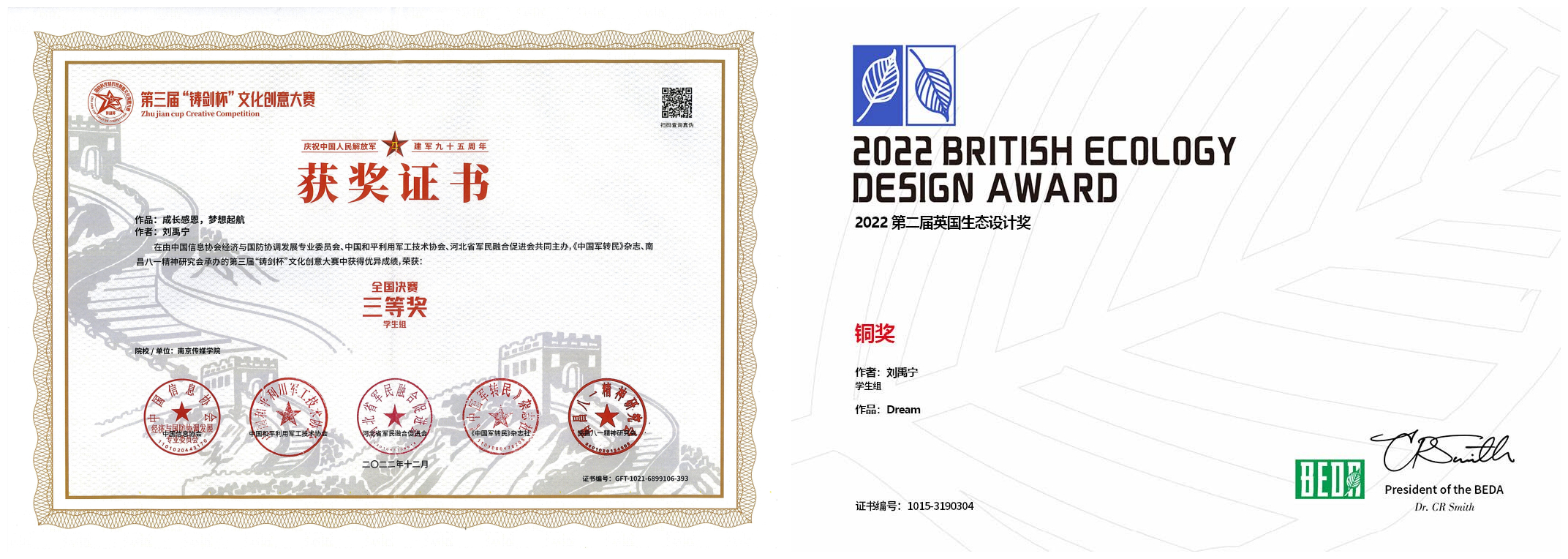 - 2022年11月01日,摄影作品《Dream》荣获第二届英国生态设计奖铜奖。